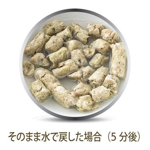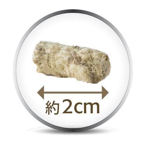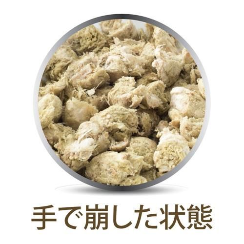 また、一般的なドライフードのように、肉食動物である犬や猫にとって不要な、穀類・イモ類・豆類などの、粘性の高い、ツナギや量増しとしての原材料を一切使用していないため、1粒1粒が柔らかく、簡単にほぐせるようになっています。