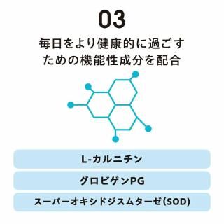 抗酸化酵素であるスーパーオキシドジスムターゼ(SOD)、健康的な身体づくりをサポートするL-カルニチン、健康的な口内環境の維持をサポートするグロビゲンPGを配合しています。