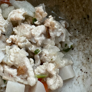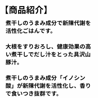 原材料 豚肉、大根、里芋、人参、もやし、ゴボウ、小松菜、マイタケ、いりこ出汁(無塩)