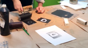 指導員は一枚の薄いプラスティックのようなプレートを取り出し、彫刻刀で簡単に彫って見せてくれました。そしてローラーでインクを塗って紙を載せて、一連の作業を説明してくれました。